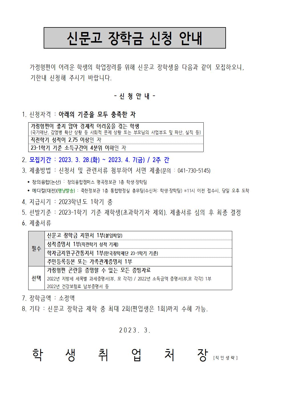 | 제목 | 2023-1학기 신문고 장학금 선발 및 신청안내(~4.7까지) | ||||