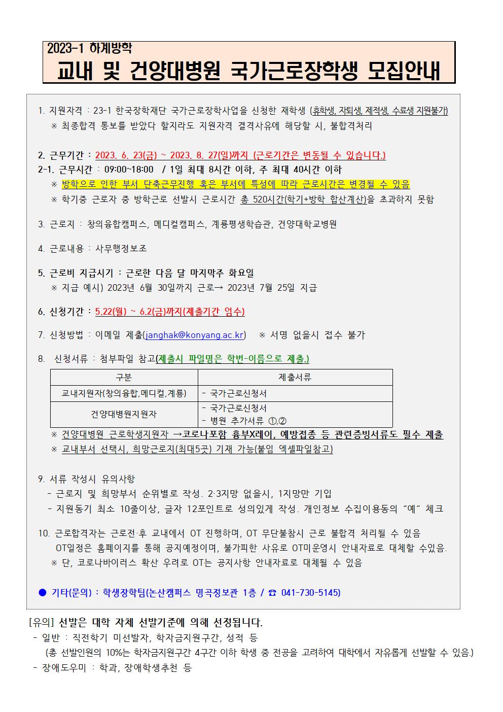 『 ★5.22~6.2까지★ 하계방학중 국가근로장학생 모집안내(교내,건양대병원) 』글의 상세내용을 확인하는 표로 제목, 부서명, 등록일, 조회, 첨부, 내용으로 나뉘어 설명합니다.