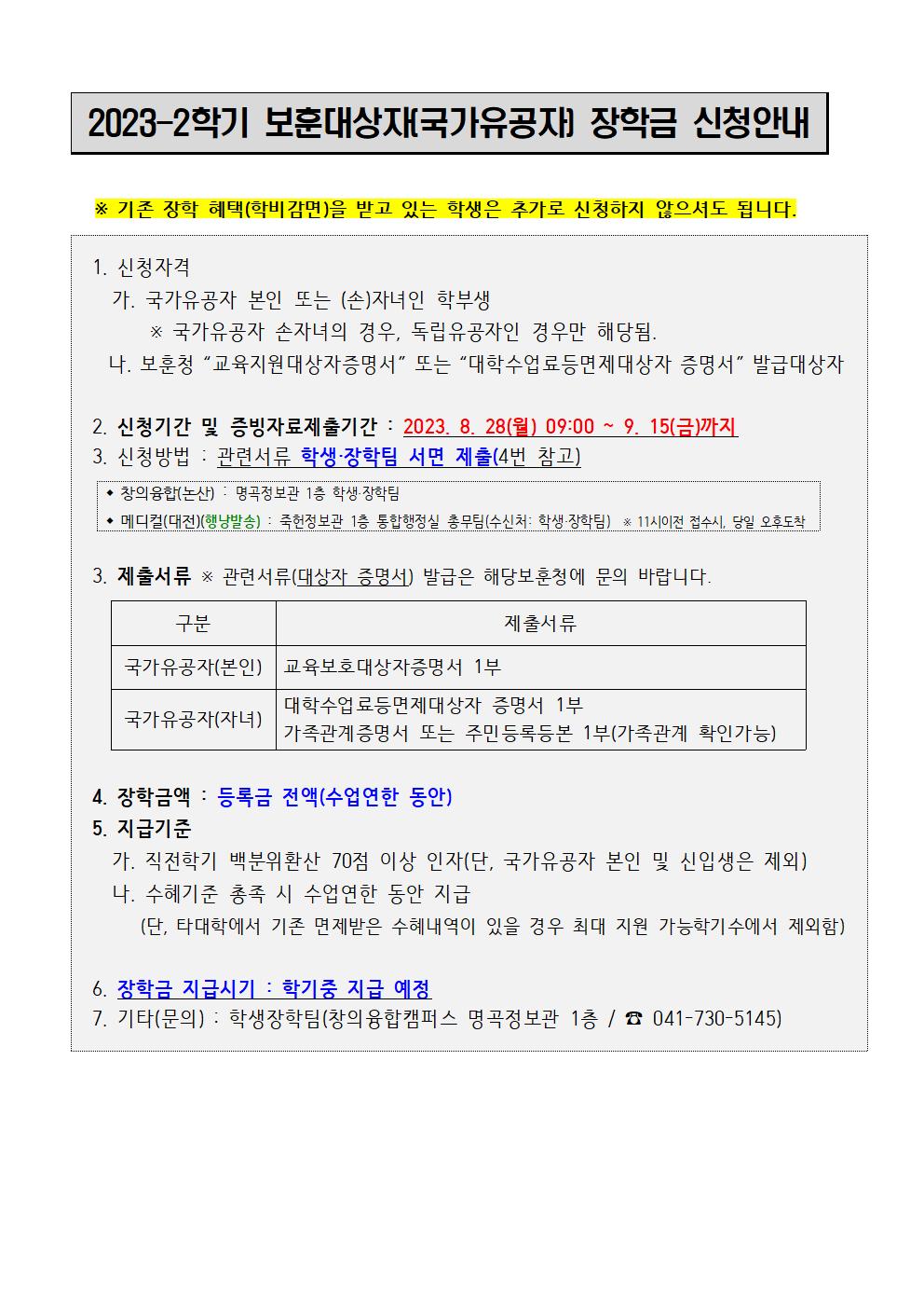| 제목 | ★8.28~9.15까지★2023-2학기 대학 보훈대상자(국가유공자) 장학금 신청안내(신규자) | ||||