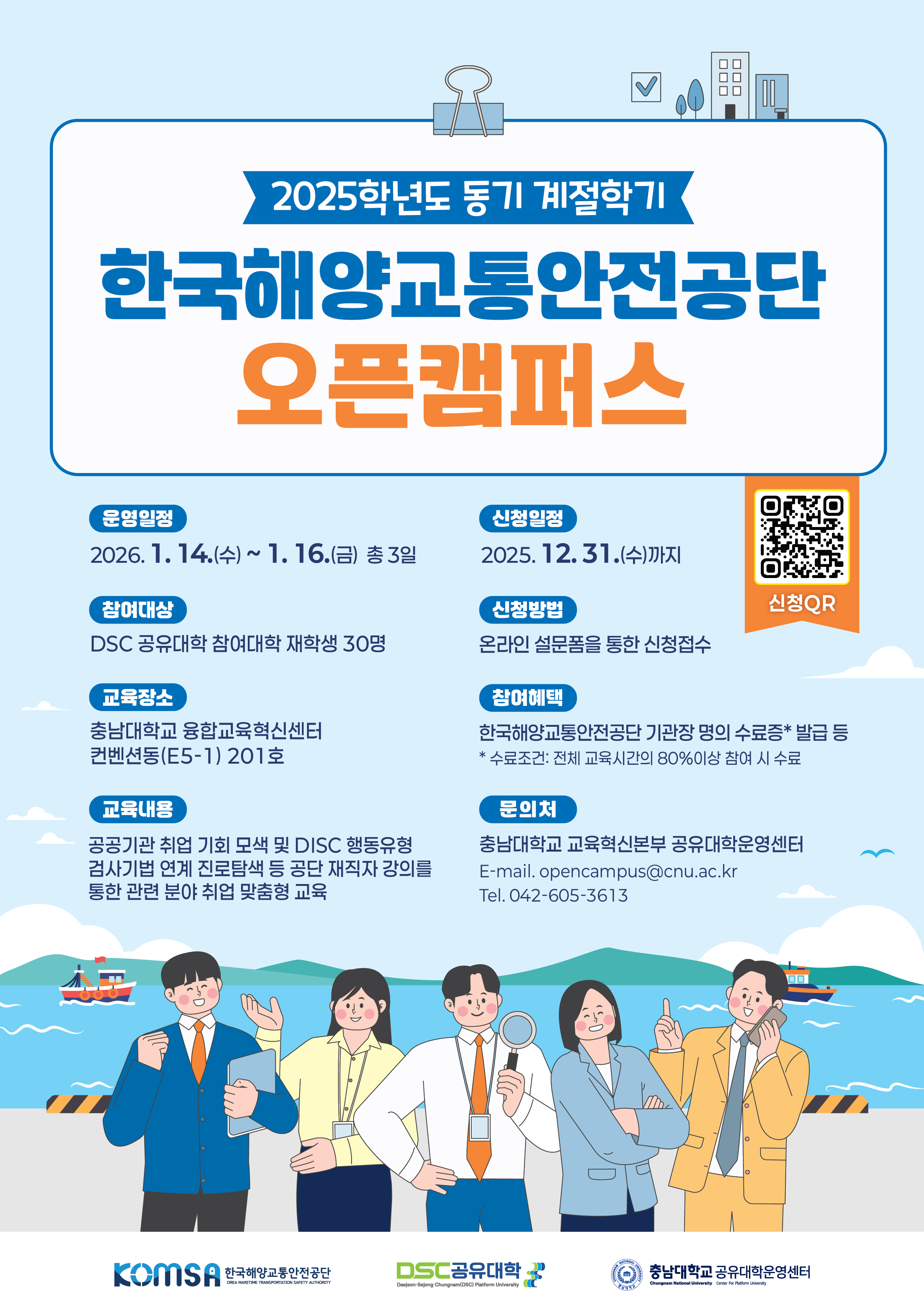 | 제목 | 2025학년도 동기 계절학기 한국해양교통안전공단 오픈캠퍼스 참여자 모집 안내 | ||||