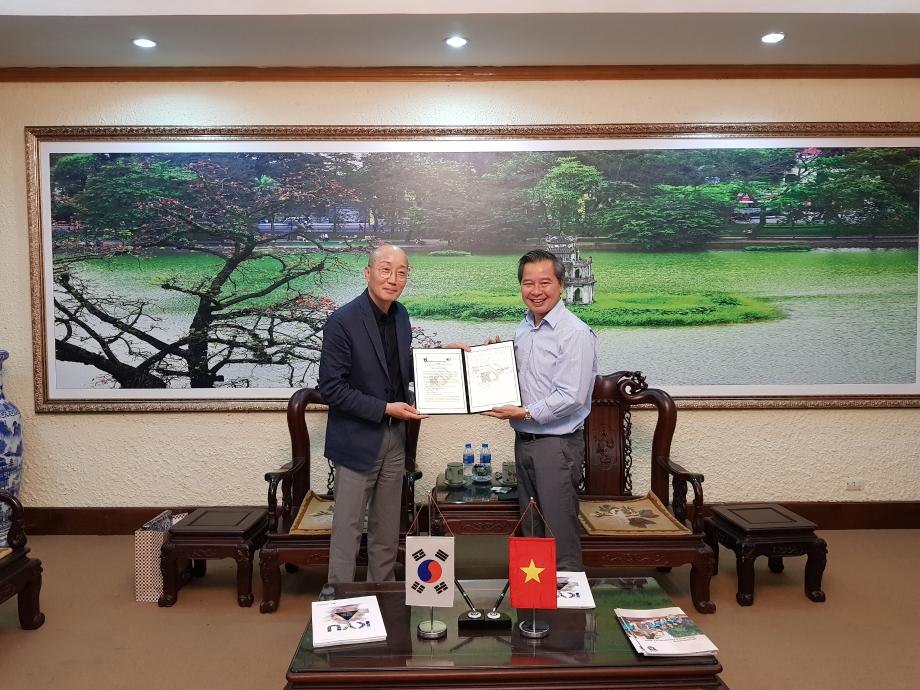 <사진설명> 9일 베트남 하노이 현지에서 건양대학교 국제교육원 윤석남 원장(왼쪽)과 하노이 국립대학 인문사회과학대학교 팜 퀑 민 총장이 협약서에 서명하고 기념촬영을 하는 모습