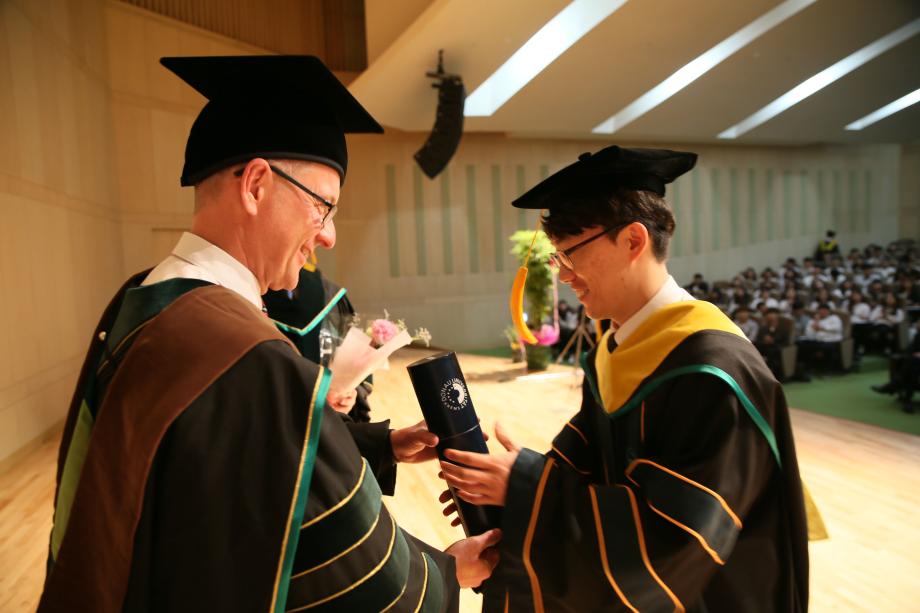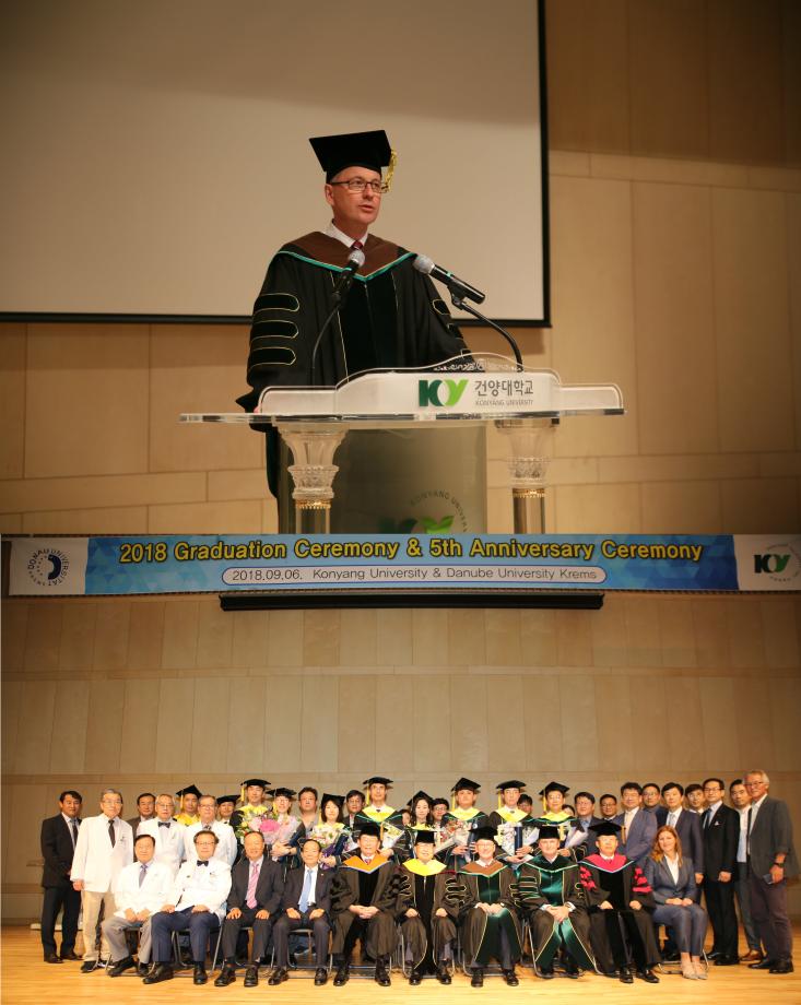 [사진설명] 사진 1. 다뉴브대 파울함머 총장이 졸업생에게 졸업증서를 전달하는 모습 사진 2. 다뉴브대 파울함머 총장이 졸업생들에게 축사를 하는 모습 사진 3. 기념식에 참석한 건양대 및 다뉴브대 관계자와 졸업생, 건양대병원 관계자들이 기념사진을 촬영하는 모습