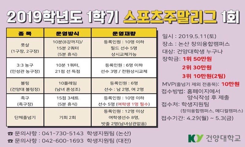 [수정 및 추가 안내사항] : 접수 마감(5.3(금) 18시) * 장학금 및 장학증서는 대표학생에게만 지급됨(우승팀의 팀원일 경우에는 학적자료 및 장학재단의 장학관련 사항에 기록되지 않습니다.) * 접수팀 미달로 경기운영이 불가능 할 경우 개최가 되지 않을 수 있음을 양해해 주시기 바랍니다. * 경기진행에 대한 세부사항은 게시판 및 문자로 안내 예정 |