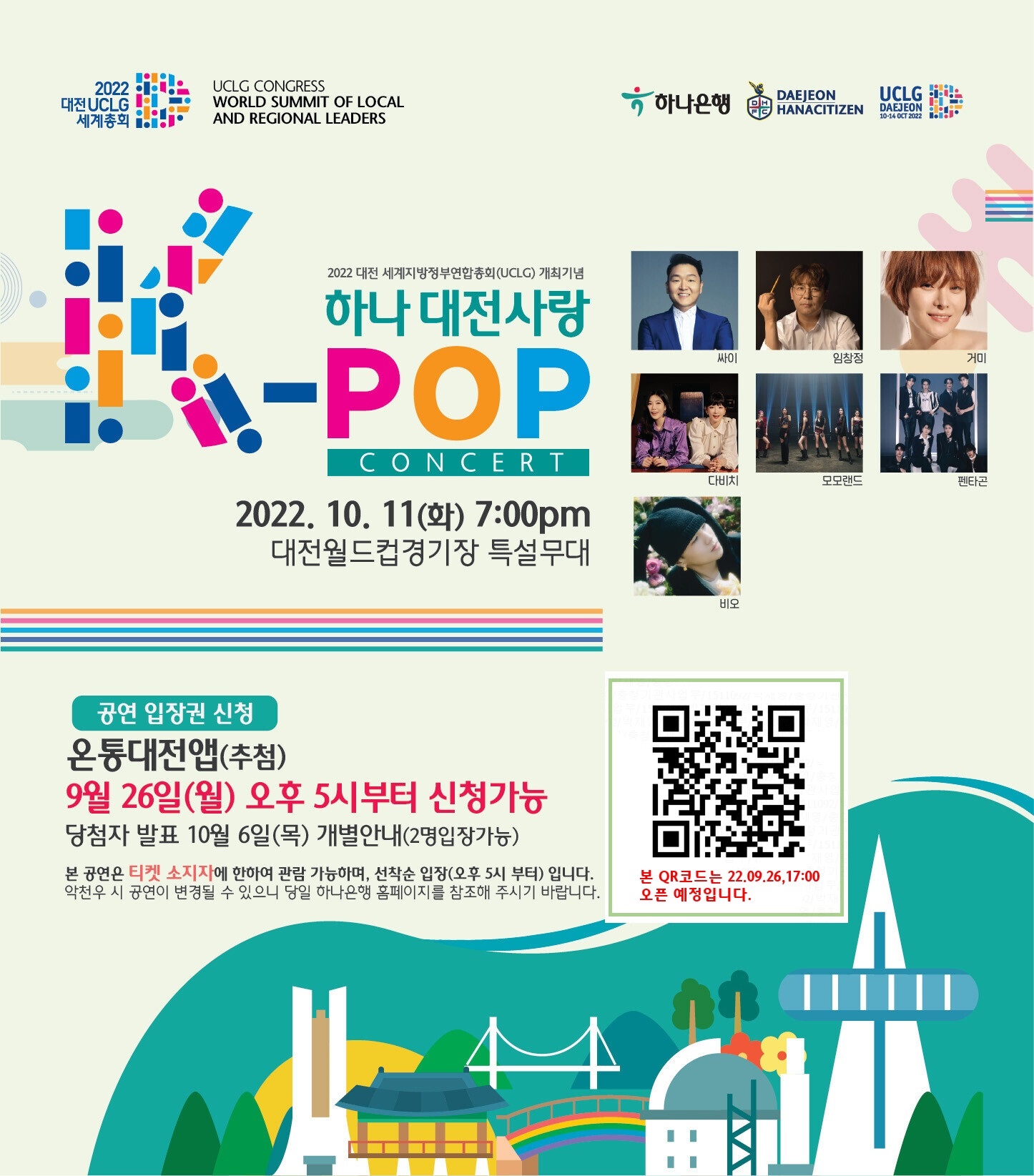 | 제목 | 2022 하나 대전사랑 K-POP 콘서트 안내(9.26.월. 17부터 공연입장권 신청) | ||||