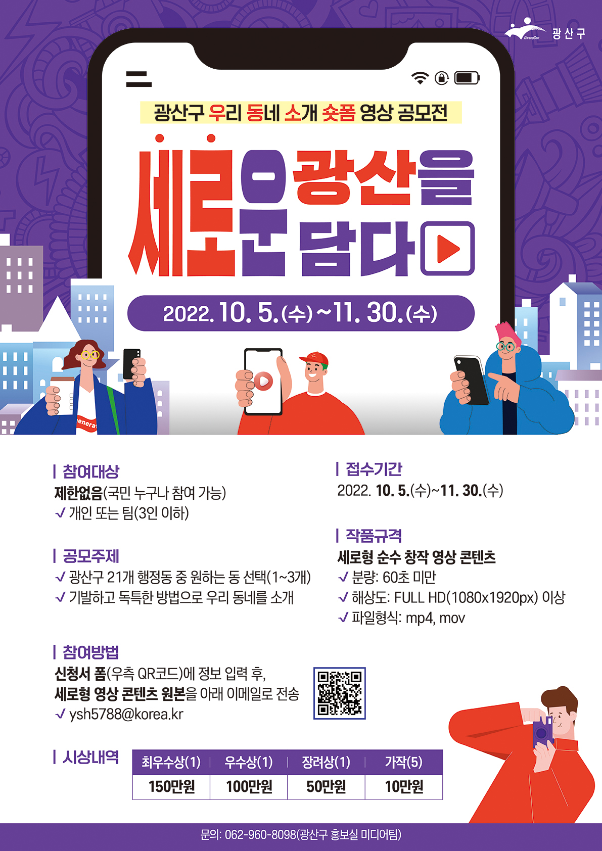 | 제목 | 서울 광산구 "우리 동네 소개 숏폼 영상 공모전" 개최 안내 | ||||