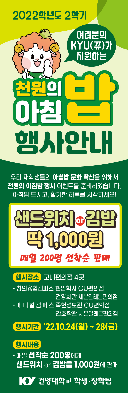 | 제목 | 2022학년도 천원의 아침밥 행사안내 | ||||