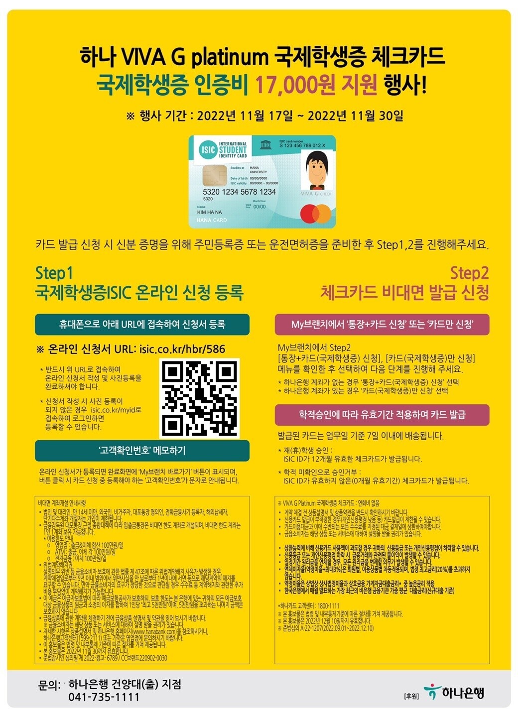 | 제목 | 하나은행 국제학생증 체크카드 '국제학생증 인증비 17,000원 지원' 행사 안내 | ||||