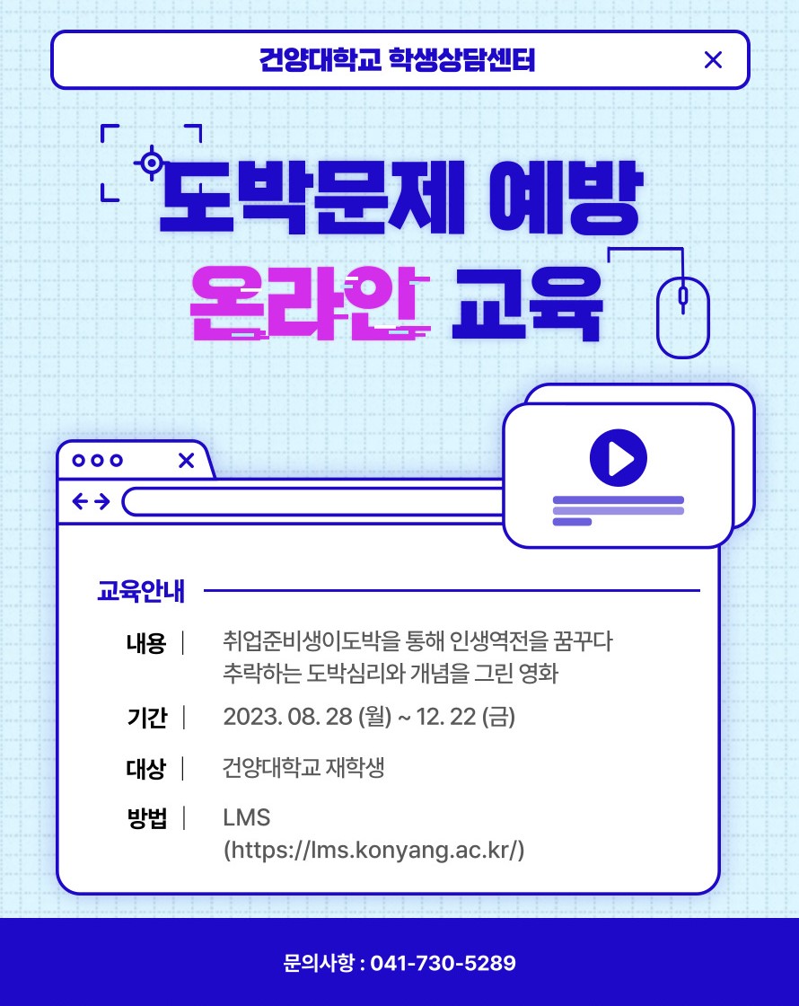 | 제목 | [학생상담센터] 2023학년도 대학생 도박 문제 예방 교육 안내 | ||||