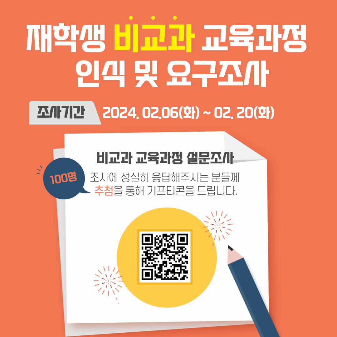 조 사 명 : 2023학년도 재학생 대상 비교과 교육과정 인식 및 요구조사 조사기간 : 2024.02.06(화) ~ 02.20(화) 조사대상 :본교 재학생 참여혜택 : 조사에 성실히 응답해주신 학생 100명 선정하여 커피 기프티콘 지급 참여링크 : https://m.site.naver.com/1iCeZ