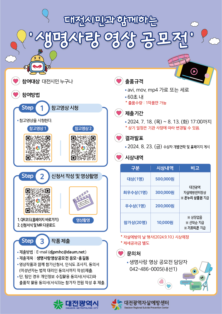 | 제목 | [대전광역자살예방센터] 2024년 대전시민과 함께하는 생명사랑 영상 공모전 | ||||
