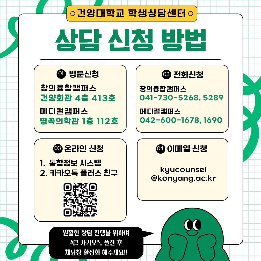[학생상담센터 상담신청 방법 및 절차 안내] 1. 방문신청 - 창의융합캠퍼스 건양회관 4층 413호 - 메디컬캠퍼스 명곡의학관 1층 112호 2. 전화신청 - 창의융합캠퍼스 041-730-5289/5268 - 메디컬캠퍼스 042-600-1678/1690 3. 온라인신청 - 통합정보시스템: 대학생활 - 전문상담 - 상담신청 - 개인상담 - 카카오톡 플러스친구: https://pf.kakao.com/_Hvgxjxb/chat ※ 원활한 상담신청을 위해 카카오톡 플러스친구 채팅창을 활성화 해주세요! 4. 이메일신청 - kyucounsel@konyang.ac.kr |