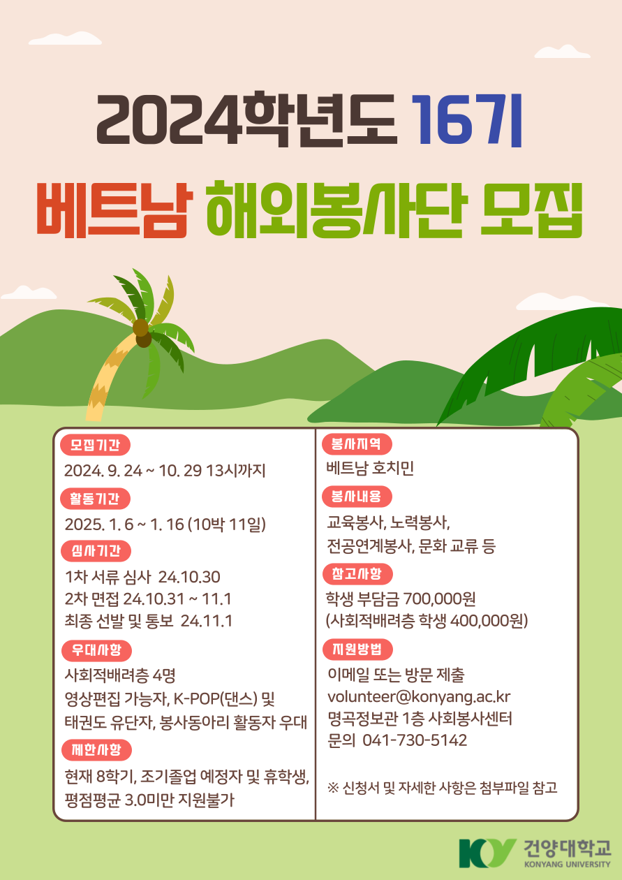 | 제목 | 2024학년도 16기 베트남 해외봉사단 모집 공고(연장) | ||||||||