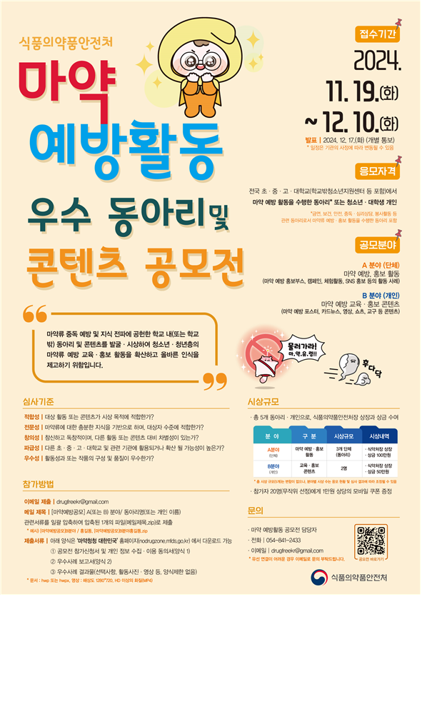 | 제목 | 2024년 마약 예방활동 우수 동아리 공모전 개최 알림 | ||||