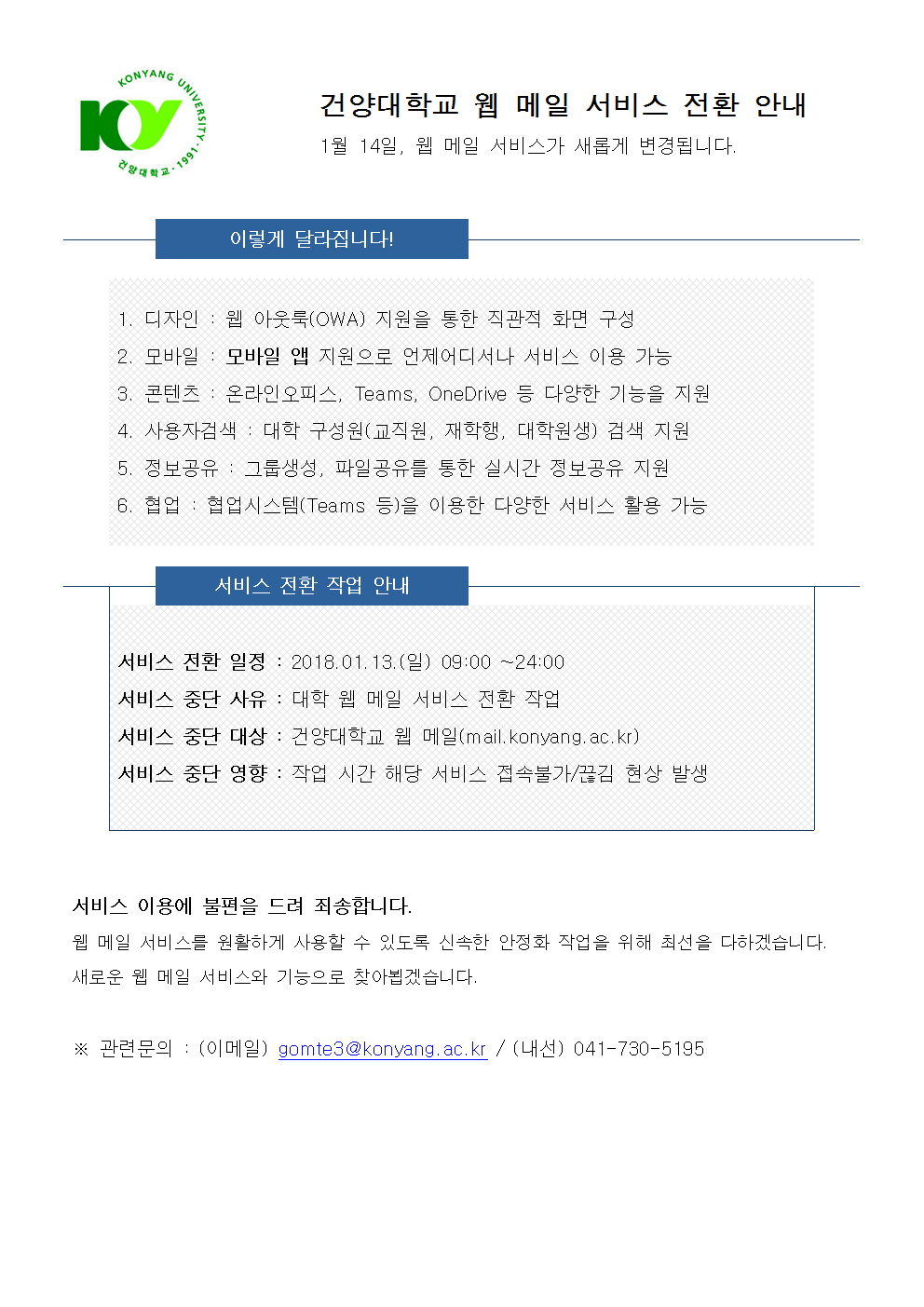 건양대학교 웹 메일 서비스 전환 안내 글의 상세내용