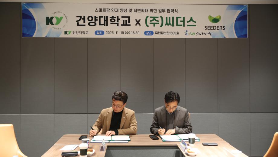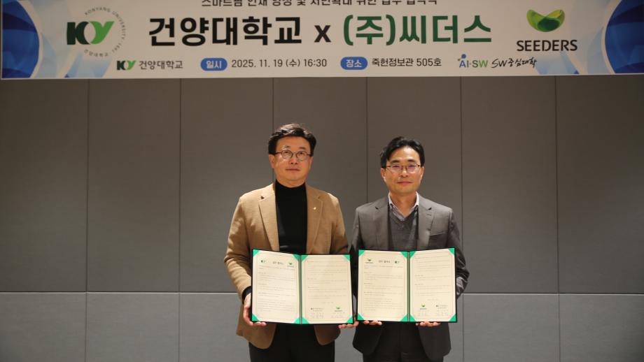 건양대학교, SW중심대학사업단 SEEDERS와 업무협약 체결 “지역 산업과 미래 인재 양성 위한 산학협력 강화” 건양대학교(총장 김용하) SW중심대학사업단(단장 김용석)은 11월 19일 소프트웨어 인재 양성과 지역 산업 발전을 위해 ㈜씨더스(SEEDERS)(대표 조성환)와 업무협약을 체결했다. 이번 협약은 스마트학과 신설과 연계해 지역 기업과의 산학협력을 강화하고, 미래 AI·SW융합 인재를 양성하기 위한 전략적 파트너십이다. **㈜씨더스(SEEDERS)**는 스마트팜, AI, 바이오정보 분야에서 혁신 기술을 선도하는 기업으로, 이번 협약을 통해 건양대학교와 함께 ▲스마트팜 기반 기술 공동연구 ▲테스트베드 구축 ▲AI·IoT 융합 프로젝트 등을 추진할 예정이다. 또한, 현장 실습 기회 제공과 전문인력 양성을 위한 공동 교육과정 운영에도 협력한다. 건양대학교는 2026년부터 스마트학과를 신설하여 AI·SW 융합 교육을 강화하고, 신입생 전원에게 100만 원의 장학금을 지급하는 등 학생 지원을 확대할 계획이다. AISW융합대학 소속으로 운영되는 스마트학과는 산업 맞춤형 커리큘럼을 통해 지역 기업과 연계한 실무 중심 교육을 제공하며, SEEDERS와의 협력으로 현장형 프로젝트와 취업 연계 프로그램을 강화한다. 김용석 SW중심대학 사업단장은 “이번 협약은 단순한 산학협력을 넘어, 지역 산업과 대학이 함께 성장하는 모델을 만드는 중요한 계기입니다. 스마트학과 신설과 장학금 지원을 통해 학생들이 미래 산업을 선도할 역량을 갖추도록 적극 지원하겠습니다.”라고 밝혔다. 이번 협약을 통해 양 기관은 스마트산업·AI·바이오정보 융합 역량 강화, 공동 연구개발, 기술사업화 기회 발굴 등 다양한 분야에서 협력하며, 지역 산업 생태계 활성화와 미래 인재 양성에 기여할 것으로 기대된다.