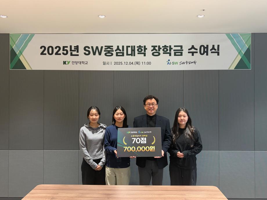 건양대학교 소프트웨어중심대학사업단, “2025년 SW중심대학 장학금 수여식”개최 2025년 장학금 1억 3천여만 원 지원… AI·SW 인재양성 본격 가속 건양대학교(총장 김용하) 소프트웨어중심대학사업단(단장 겸 AI·SW융합대학장 김용석)은 12월 4일“2025년 SW중심대학 장학금 수여식”에서 AI·SW융합대학 재학생과 신입생을 대상으로 ‘신입생 장학금’과 ‘소중마일리지 장학금’ 1억 3천여만 원을 지급하며, AI·SW 인재양성을 위한 실질적인 재정 지원을 강화하고 있다고 밝혔다. 사업단은 2025학년도 AI·SW융합대학 신입생 전원에게 1인당 100만 원씩 장학금을 지급했다. 이 장학금은 신입생의 조기 학습 동기 유발, 데이터 기반 실무역량 기초 형성, AI·SW 학습 생태계 조기 적응을 목표로 마련되었으며, 2026학년도 신입생에게도 동일한 규모의 장학금 지급을 이어갈 계획이다. 또한 사업단은 소중마일리지 장학금 제도를 통해 재학생의 비교과 활동과 실무역량 성장을 동시에 장려하고 있다. 소중마일리지는 학생이 참여한 AI·SW 교육 프로그램, 자격증 취득, 공모전, 산학 프로젝트, 클라우드·AI 실습 등 다양한 활동을 점수화해 장학금으로 환산하는 제도로, 총 47명의 학생에게 누적 마일리지 1.700여점에 해당하는 장학금이 지급됐다. 이번 2차 수여식은 학기별 활동성과를 공유하고 학생 참여 분위기를 확산한다는 점에서 의미가 크며, 사업단은 학기마다 학생 참여도를 고려해 장학금 지급을 지속할 예정이다. 이처럼 신입생 장학금과 소중마일리지 장학금을 합산하면 2025년 한 해 동안 약 1억 3천여만 원 규모의 장학금이 학생들에게 지원되며, 소프트웨어중심대학사업단은 전공·비전공 학생의 균등한 AI·SW 역량 성장을 적극 유도하고 있다. 소중마일리지 제도는 AX-SQUARE 플랫폼을 기반으로 학습·활동 데이터를 자동 관리하여 학생의 실습 성과뿐 아니라 활동 난이도와 기여도까지 반영하는 것이 특징이다. 이를 통해 학생은 자신의 역량 성장 이력을 데이터 기반으로 확인할 수 있고, 대학은 성과 중심의 SW교육을 체계적으로 운영할 수 있다. 교육 프로그램 역시 AWS·네이버 클라우드 협력 교육, XR·로봇 실습, 클라우드 실무 부트캠프, AI 창업캠프 등 실무교육 중심으로 확대 운영 중이며, 사업단은 이러한 프로그램을 마일리지 체계와 유기적으로 연계해 학생 참여를 활성화하고 있다. 김용석 단장은 “소프트웨어중심대학사업단의 장학금은 단순한 지원이 아니라, 학생이 스스로 역량을 키우고 실제 성과를 경험하도록 돕는 ‘미래에 대한 투자’다”라며 “신입생에게는 AI·SW 학습을 시작할 수 있는 안정적 기반을 제공하고, 재학생에게는 활동과 성과가 정당하게 보상받는 환경을 만들어 더 많은 학생이 SW역량을 갖춘 경쟁력 있는 인재로 성장하도록 교육·지원 체계를 지속적으로 강화하겠다”고 밝혔다.