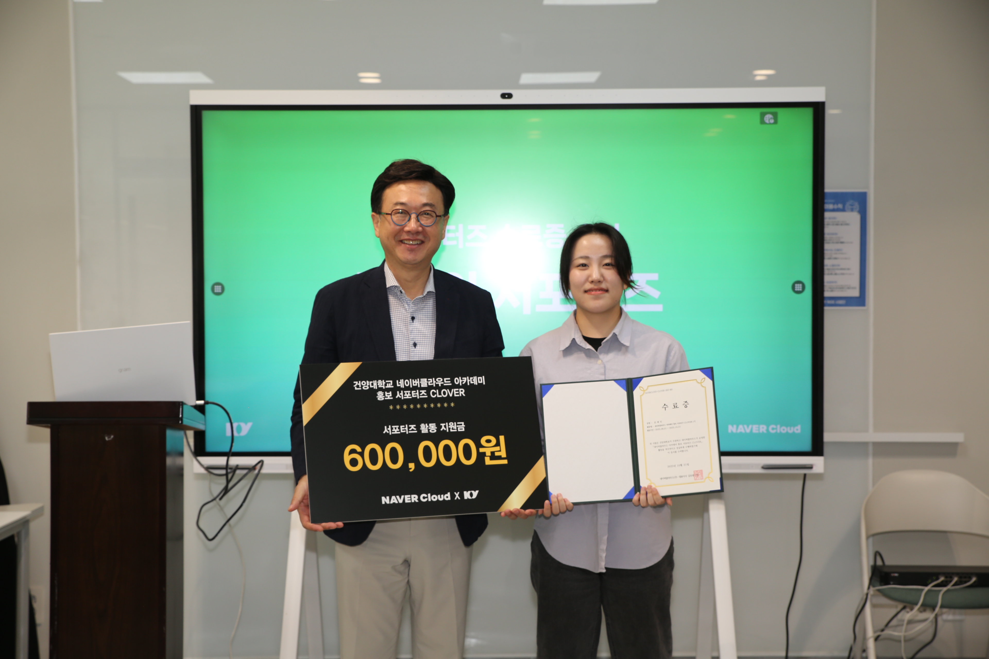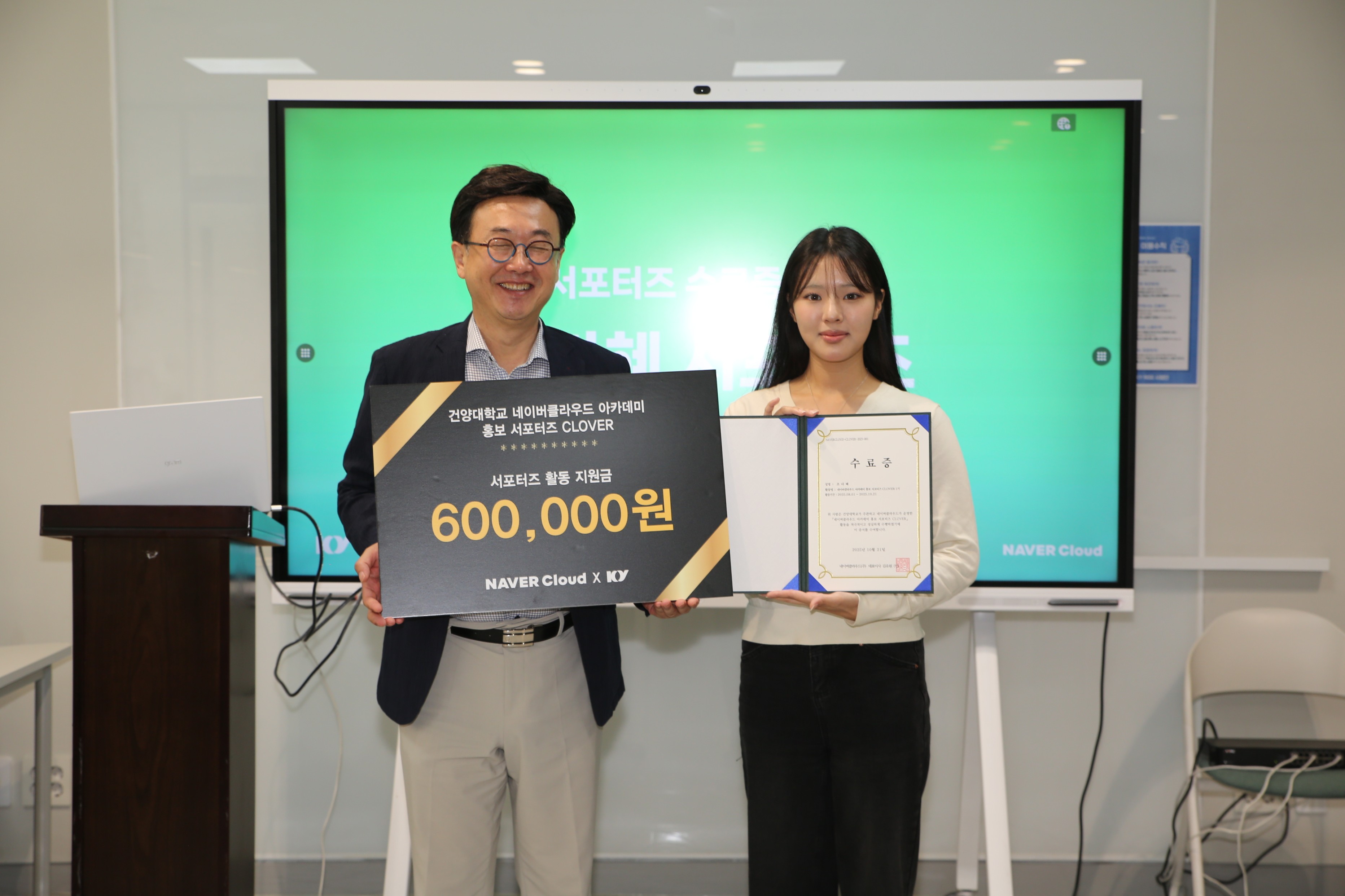 『 건양대학교 네이버클라우드 아카데미 홍보 서포터즈 CLOVER 1기 활동 』글의 상세내용을 확인하는 표로 제목, 부서명, 등록일, 조회, 첨부, 내용으로 나뉘어 설명합니다.