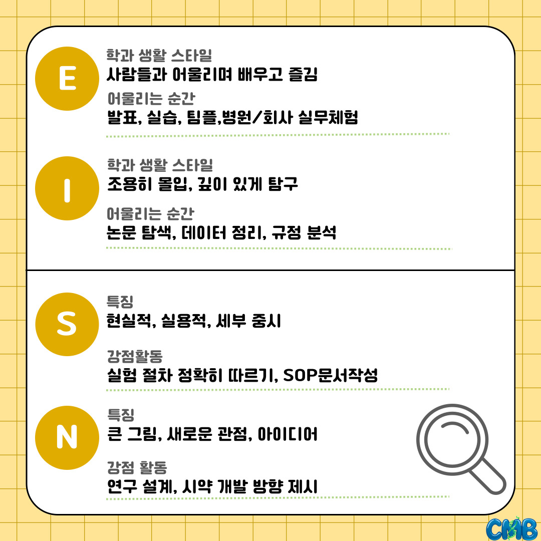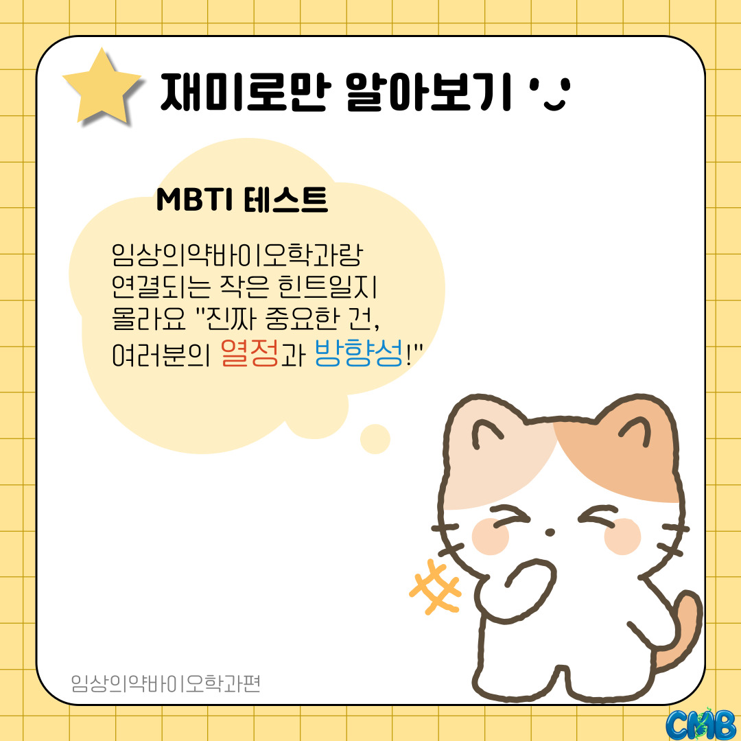 『 [카드뉴스] 임상의약바이오학과 찰떡인 MBTI는? 』글의 상세내용을 확인하는 표로 제목, 부서명, 등록일, 조회, 첨부, 내용으로 나뉘어 설명합니다.